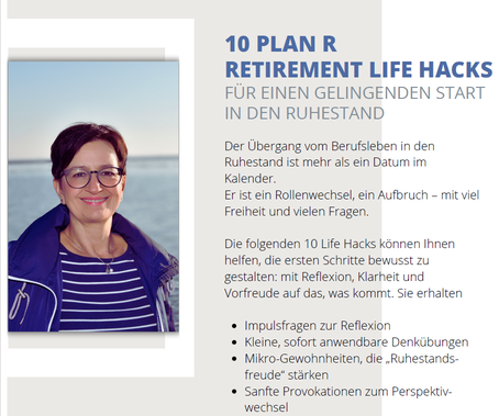 Sie möchten schon vor dem Plan R-Spaziergang aktiv werden? Schreiben Sie mir eine E-Mail mit dem Betreff "Retirement Life Hacks", erhalten Sie 10 Tipps, Mini-Übungen und Fragen und legen Sie los.